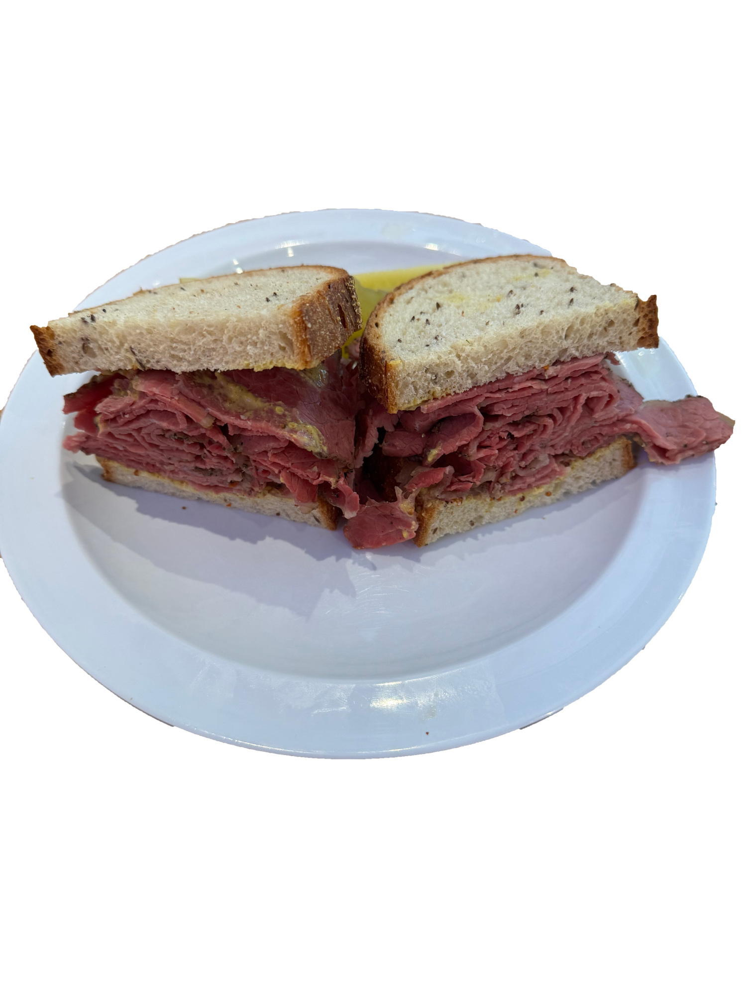 layered with a dijon mustard. Ordinarily, these ingredients wouldn’t taste amazing alone, but in a sandwich, they complement each other, mixing a strong scented mustard with a tasty cold cut of corned beef.